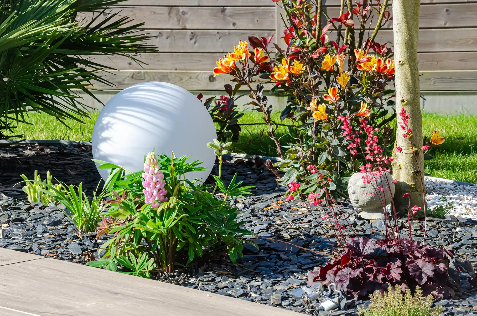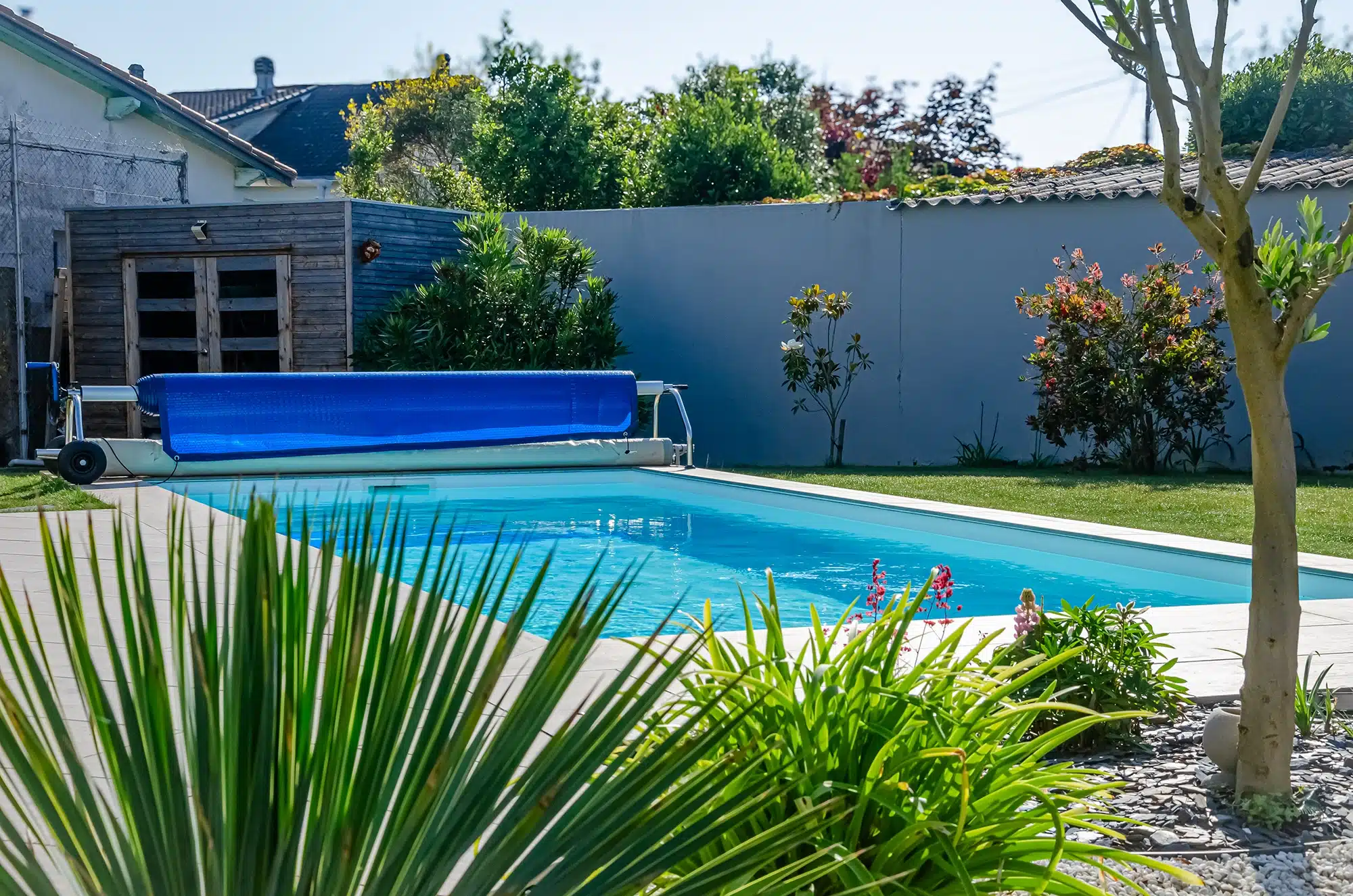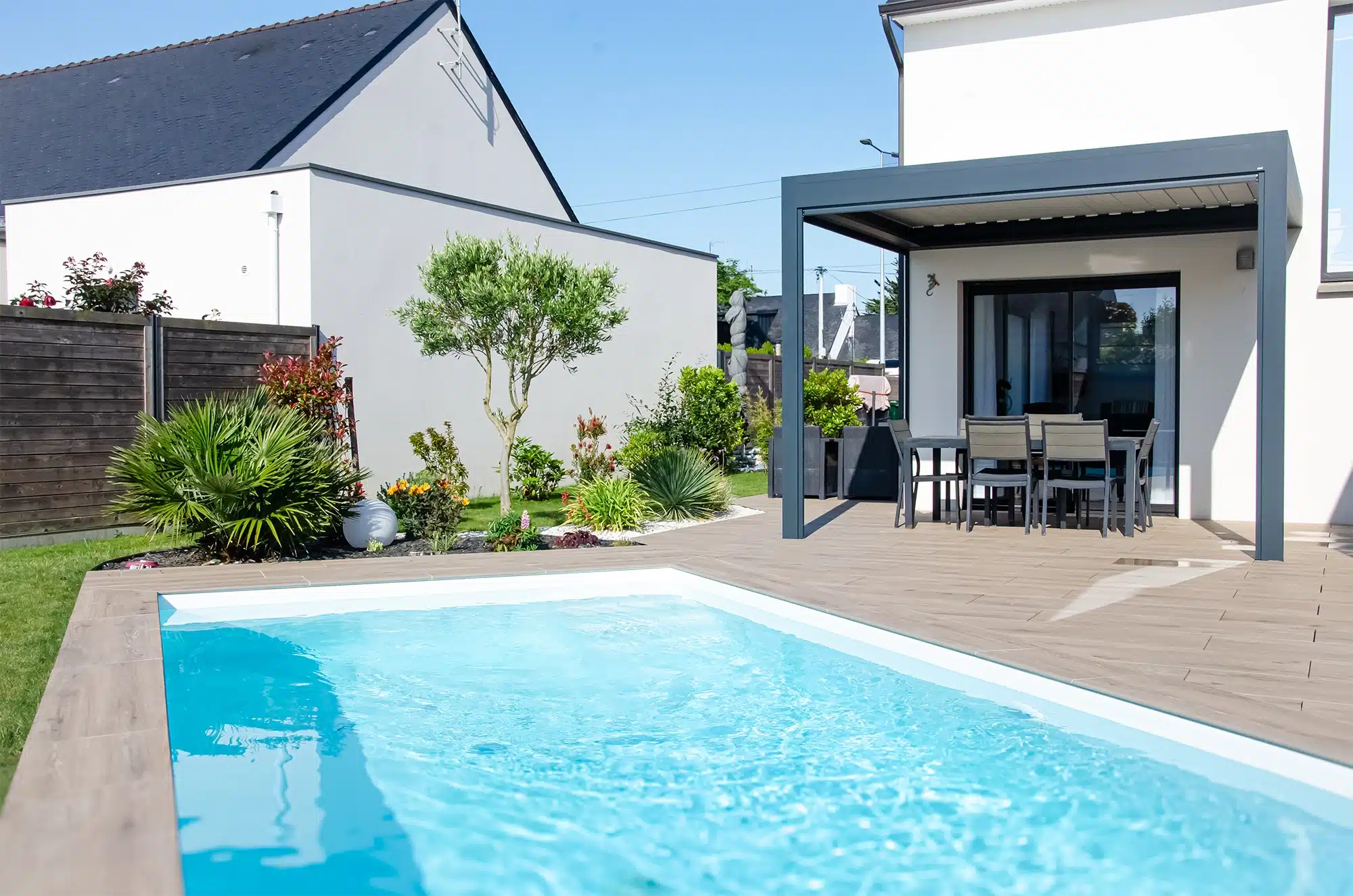 Ce jardin est pensé comme un vrai lieu de vacances. En premier lieu, la terrasse en grès cérame, aux tons chauds effet bois, prolonge la piscine et offre l’espace idéal pour profiter pleinement des beaux jours. Juste à proximité, la pergola bioclimatique permet de s’installer à l’ombre quand on le souhaite : il suffit d’orienter les lames pour créer une zone plus fraîche, tout en gardant la vue sur l’ensemble. Enfin, quand l’envie se fait sentir, la piscine est là, à deux pas, pour une baignade rapide… ou pour y passer l’après-midi.