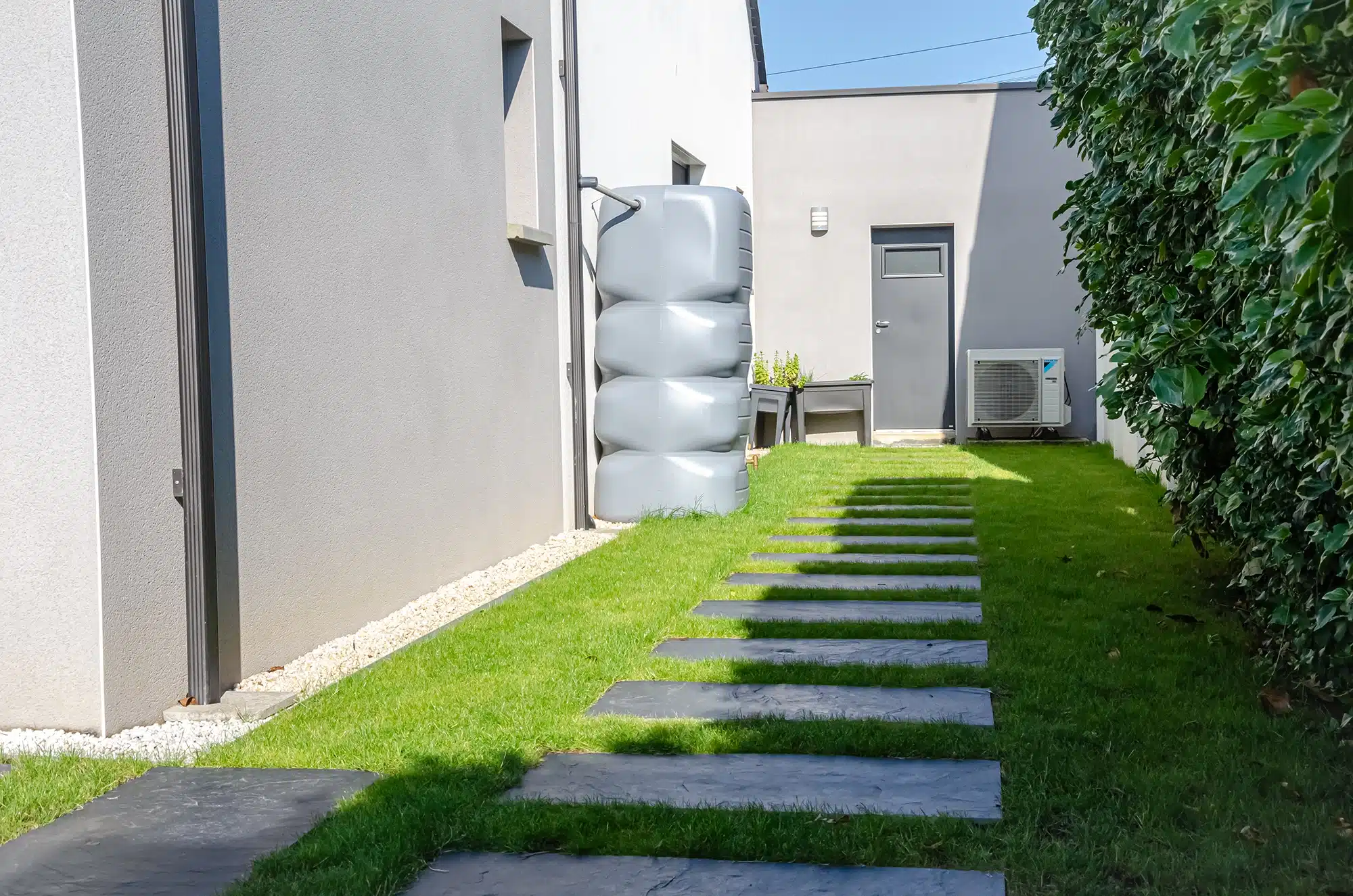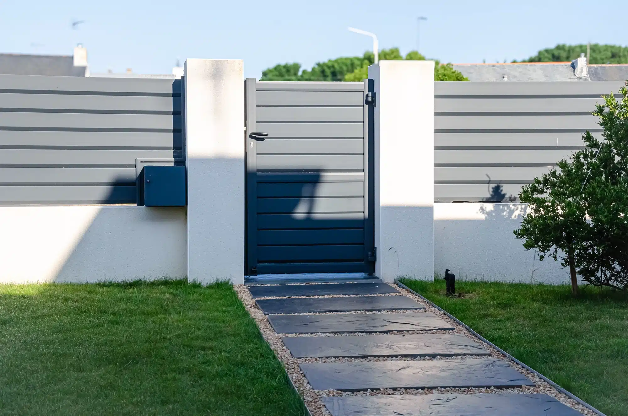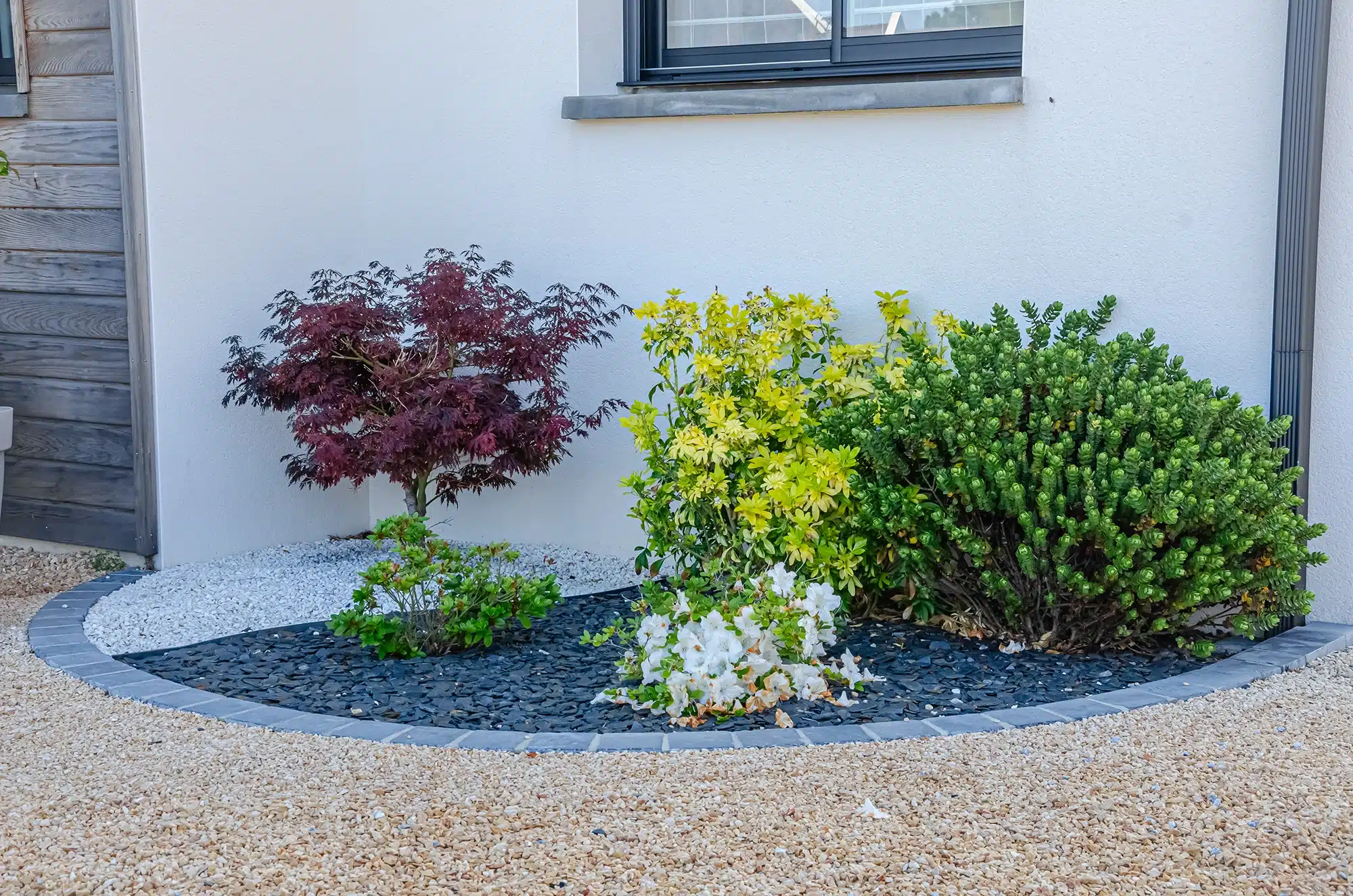 À l’avant, l’ambiance se veut minérale et fraîche. D’abord, la clôture, le portail coulissant et le portillon en aluminium cadrent l’entrée avec sobriété. Ensuite, la cour en gravier beige réchauffe l’ensemble tout en créant un stationnement pratique. Une allée en pas japonais guide alors le visiteur vers la porte d’entrée pour un accès propre par tous les temps. Enfin, une seconde ligne de dalles contourne la maison. Elle relie ainsi la terrasse aux autres lieux de vie de manière discrète.