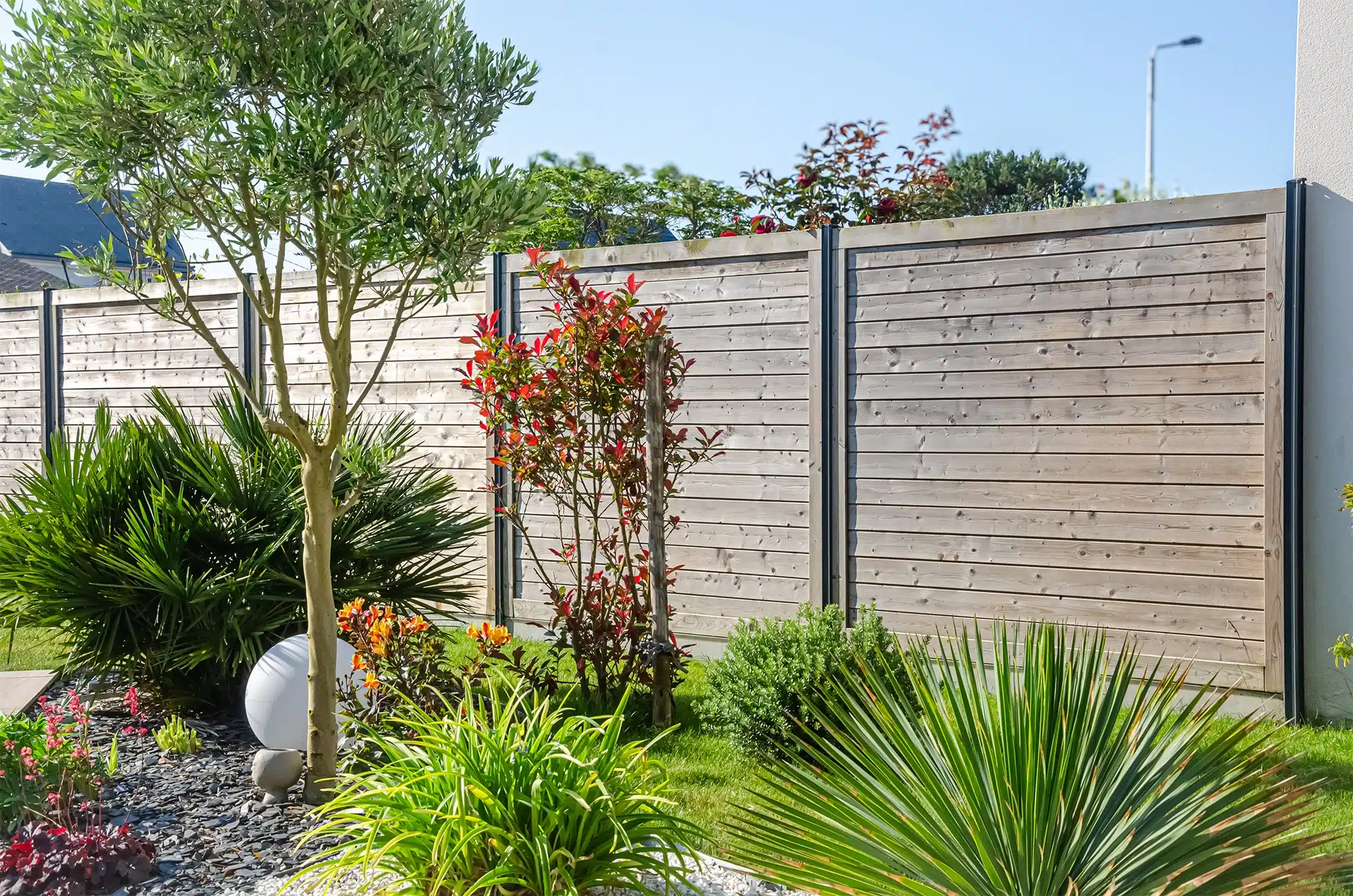 Pour ce projet, chaque matériau a été choisi pour durer et rester simple à vivre au quotidien. D’abord, le grès cérame motif bois apporte le charme d’un platelage sans ses contraintes : il ne craint ni les éclaboussures de la piscine, ni le soleil, et se nettoie facilement. Par ailleurs, les pas japonais offrent un cheminement net et confortable. Côté entrée, le gravier beige assure un sol drainant, tout en éclaircissant l’ensemble. Enfin, l’aluminium de la pergola et des clôtures garantit une finition sobre, résistante aux embruns, avec un entretien minimal, l’idéal pour profiter du jardin sans y passer ses week-ends.
