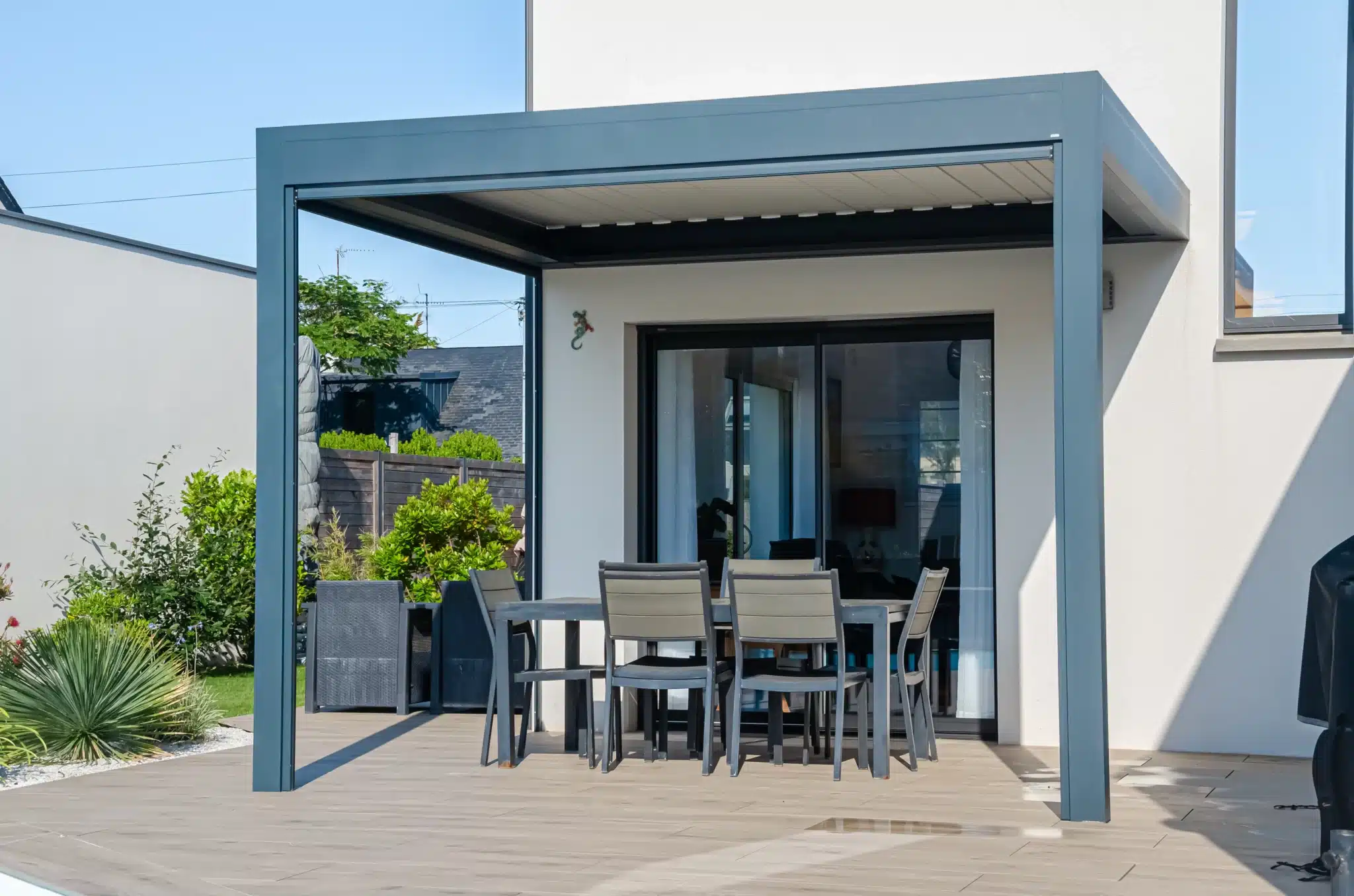 Elle permet de moduler l’ombre et la ventilation selon le moment de la journée, pour profiter de la terrasse même en plein été.