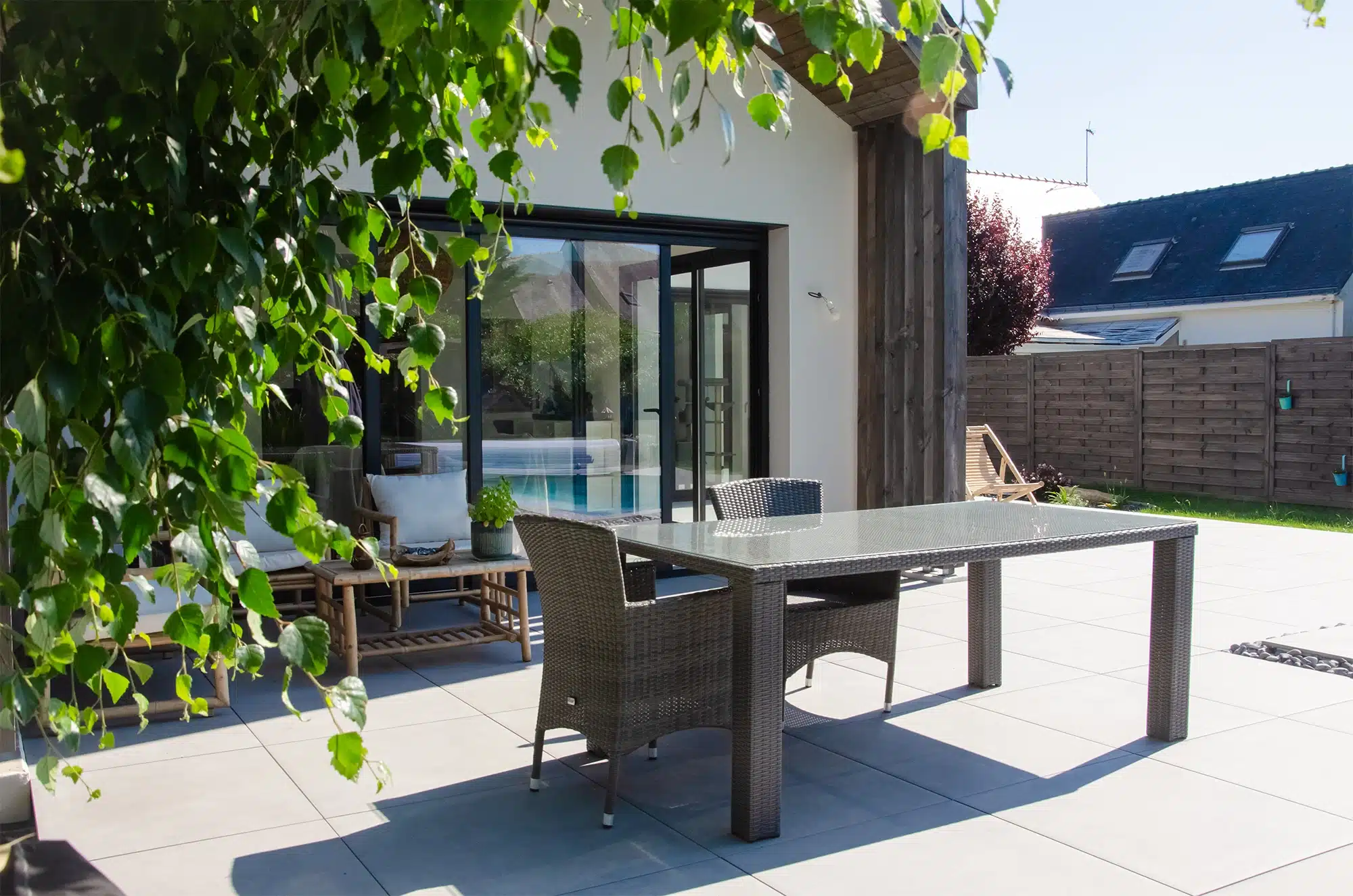 La création d’une terrasse autour d’une piscine au Pouliguen a été pensée comme le prolongement naturel du dallage intérieur. D’abord, cet aménagement en grès cérame dessert toutes les baies vitrées et sécurise les abords du bassin. La terrasse devient ensuite une véritable pièce de vie supplémentaire. Elle structure les circulations tout en créant des zones dédiées aux repas et à la détente. Enfin, la gestion des niveaux et l’éclairage discret assurent un usage confortable et esthétique, de jour comme de nuit.
