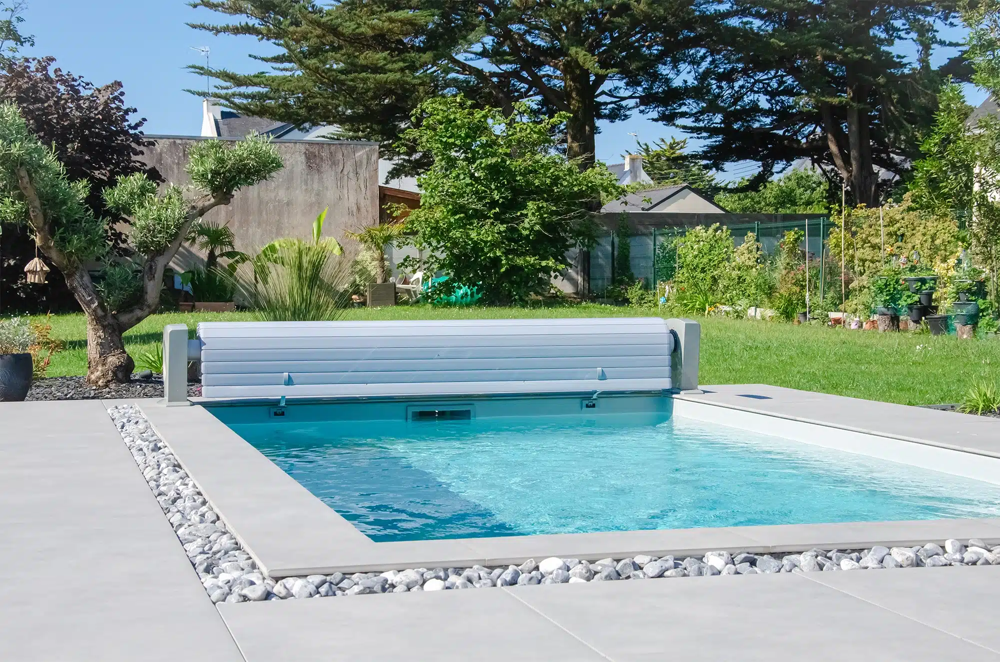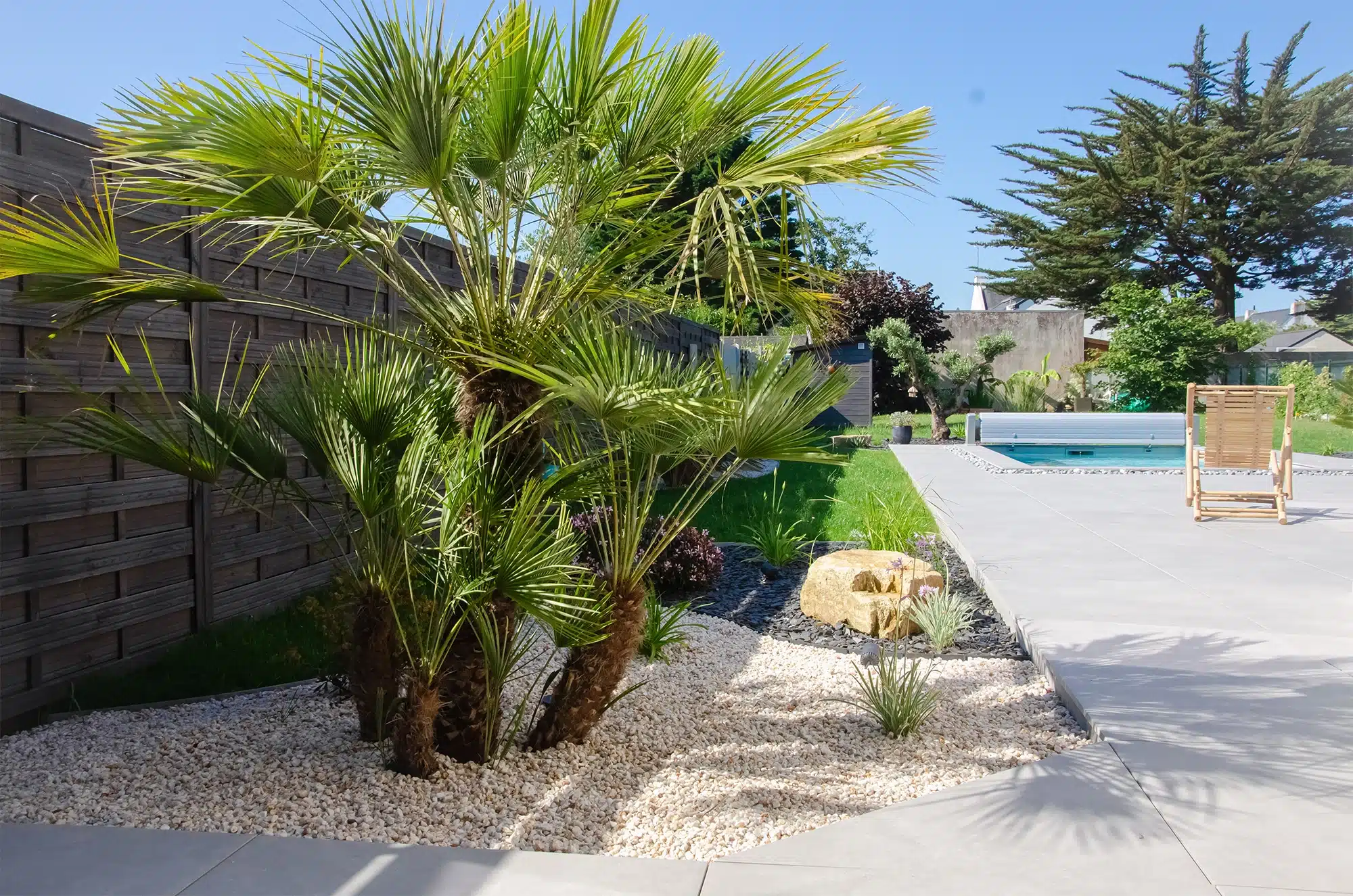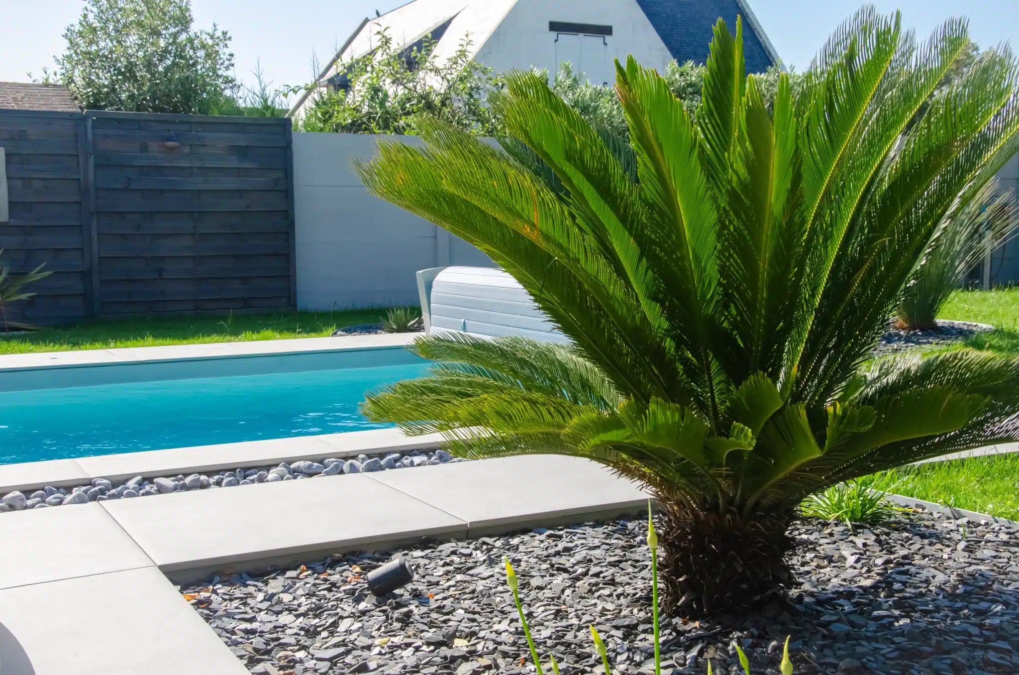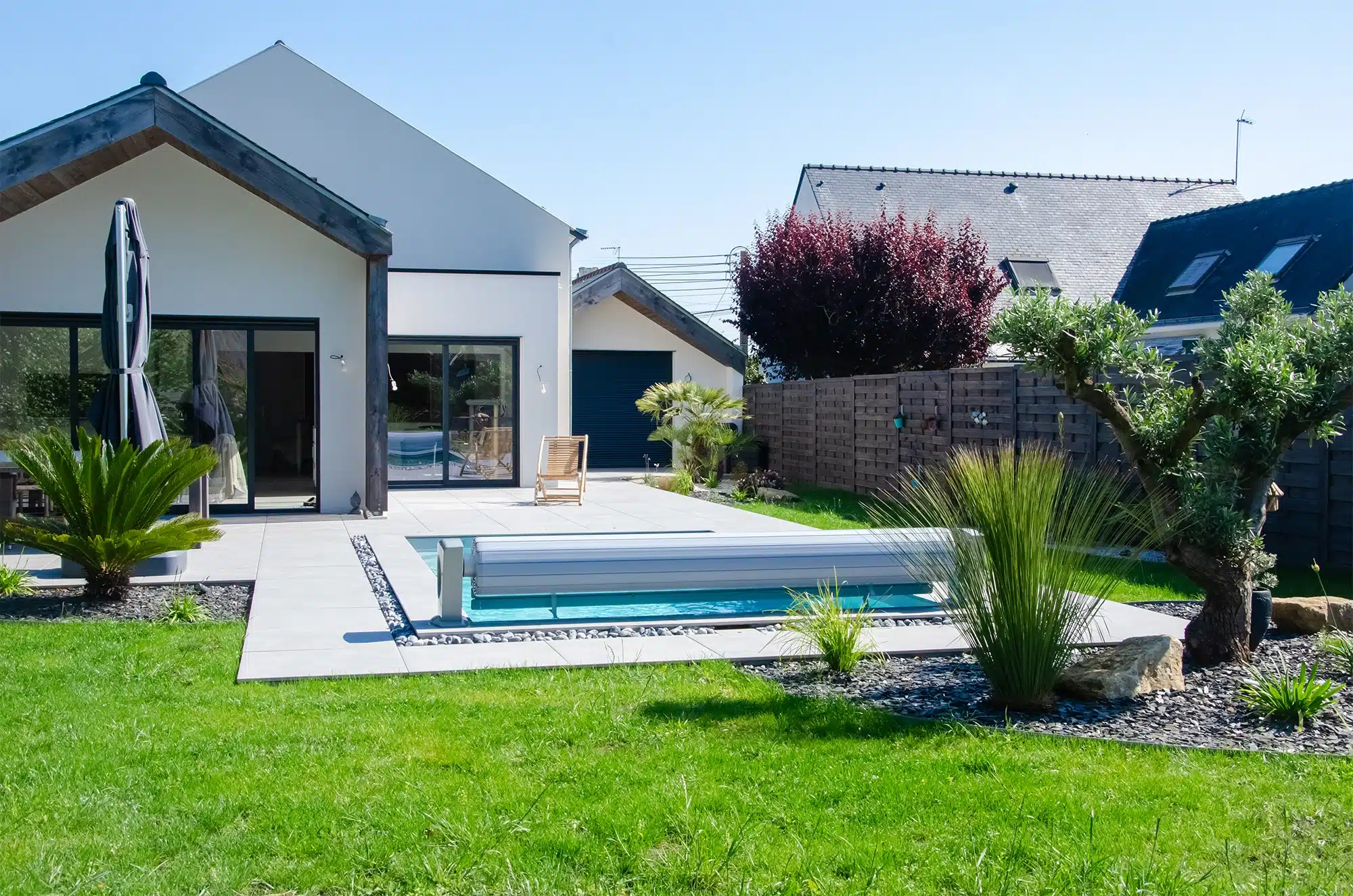 C’est une véritable parenthèse de détente, au printemps comme en été. D’abord, la couleur de l’eau se nuance au gré du ciel. La grande terrasse accueille ensuite facilement les moments à plusieurs, entre bains de soleil et pauses à l’ombre. Enfin, le gazon et les plantations enveloppent la piscine pour renforcer cet esprit vacances.