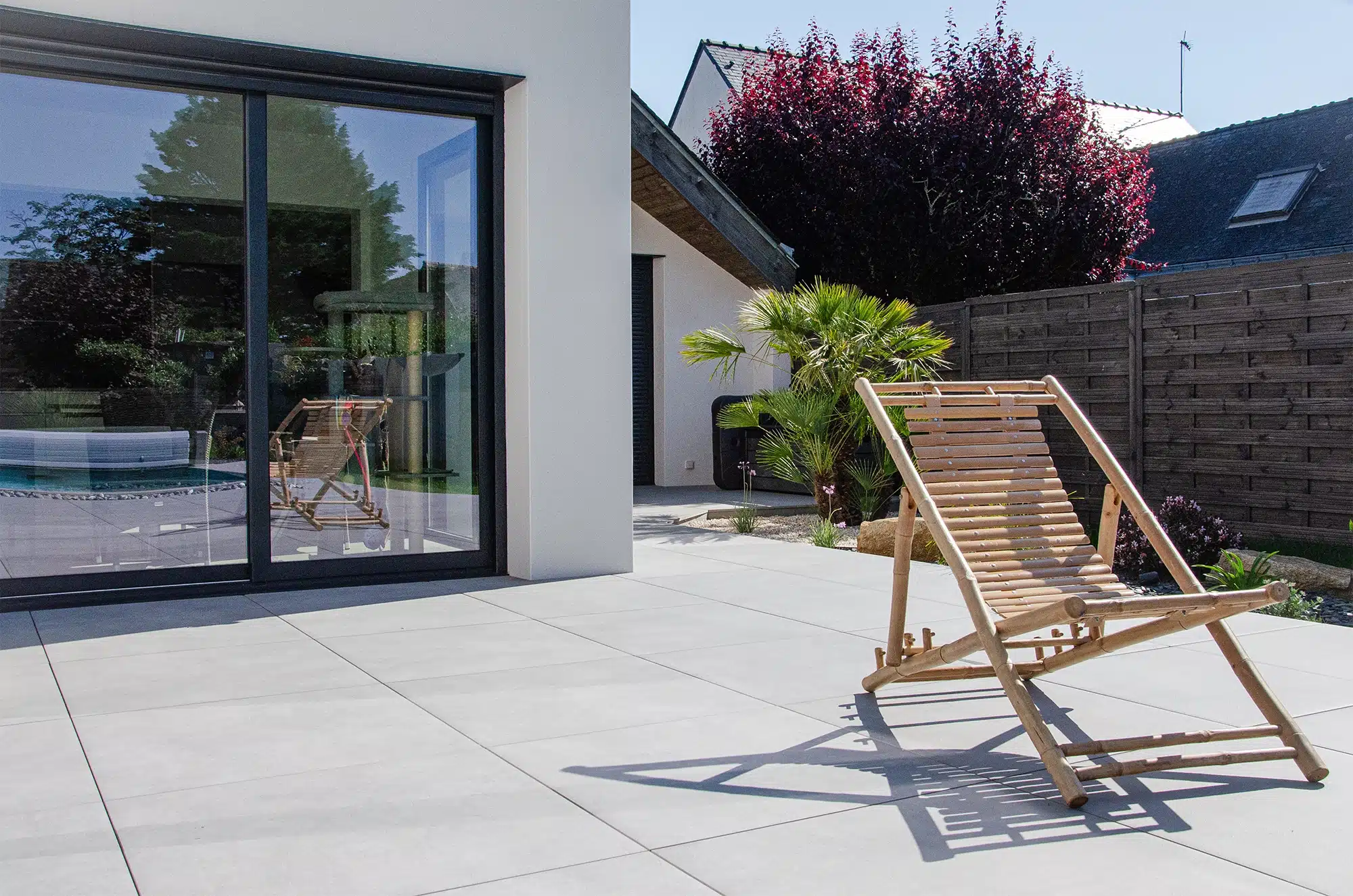 Le grès cérame s’est imposé pour sa résistance et sa stabilité dans le temps. D’abord, il supporte l’humidité, les variations de température et l’usage intensif d’un contour de bassin. De plus, sa finition antidérapante sécurise les déplacements, même sur sol mouillé, tout en restant simple à entretenir. Enfin, sa teinte gris clair limite la montée en température au soleil : un vrai confort pieds nus pour profiter pleinement de la piscine.